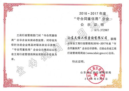 日前,山东省工商局网站发布了《山东省工商局关于公示2016~2017年度山东省“守合同重信用”企业的公告》,山东天佑工程咨询有限公司荣耀上榜。