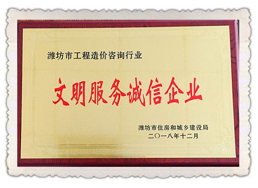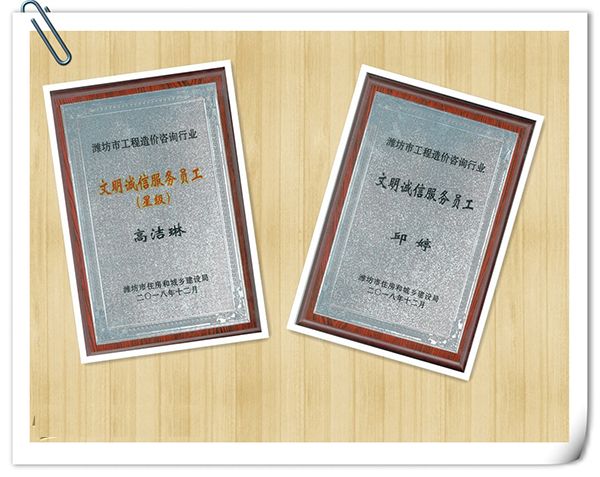 日前,在潍坊市住房和城乡建设局开展的全市工程造价咨询行业“争创文明服务企业、争创文明诚信服务员工”活动中,公司获“文明服务诚信企业”称号,邱婷、高洁琳同志获“文明诚信服务员工”荣誉。