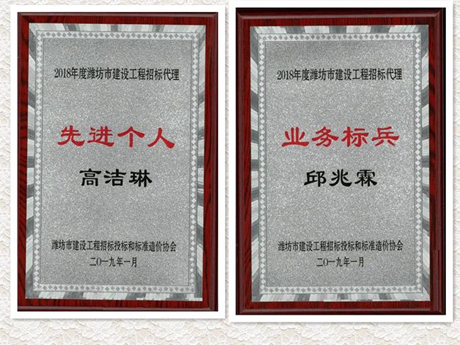 在潍坊市建设工程招标投标和标准造价协会举行的2018年度先进评选中,公司获 “2018年度潍坊市建设工程招投标先进单位”荣誉,公司邱兆霖、高洁琳经理分别获“2018年度潍坊市建设工程招标代理业务标兵”、“ 2018年度潍坊市建设工程招标代理先进个人”称号。
