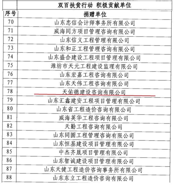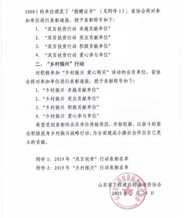 2019年,山东省工程建设标准造价协会发起了“双百扶贫行动”的倡议,我公司积极参与,勇于践行行业责任,为贫困村脱贫攻坚做出贡献,被授予“双百扶贫行动积极贡献单位”荣誉称号。